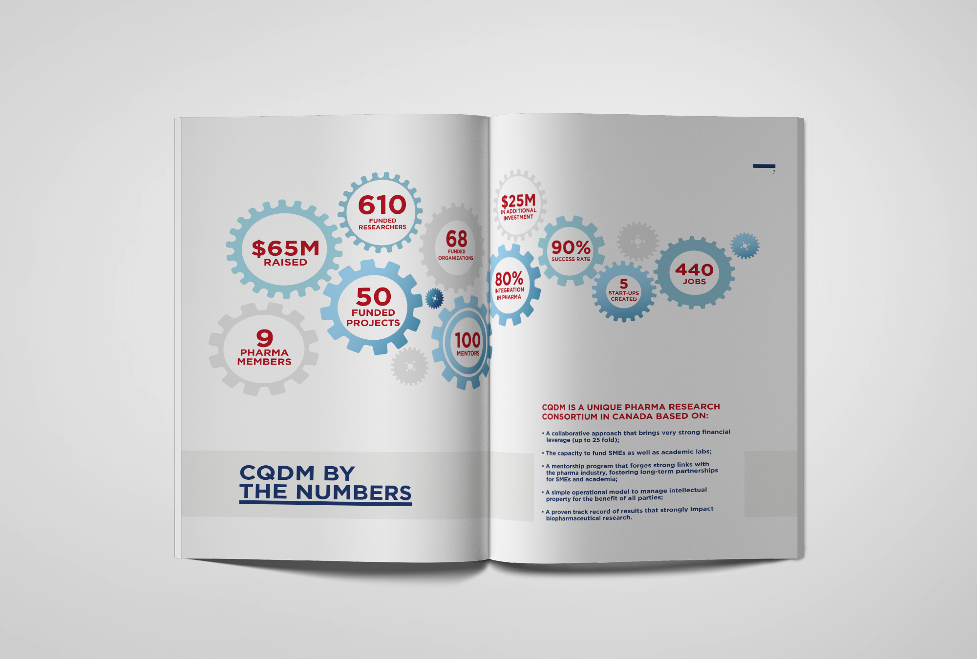 En collaboration avec le studio de design La Camaraderie à Montréal. Réalisation du rapport annuel pharmaceutique du groupe CQDM.