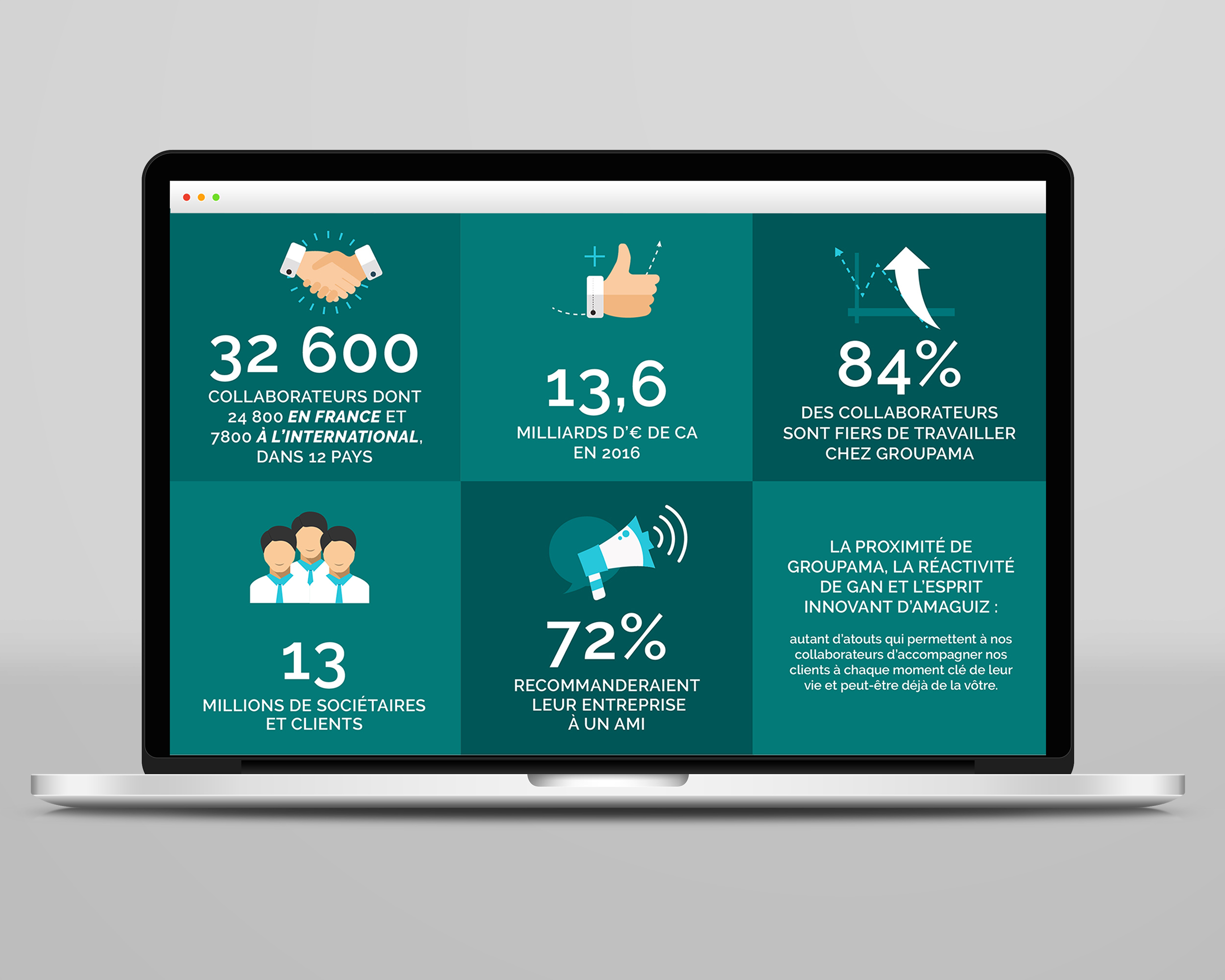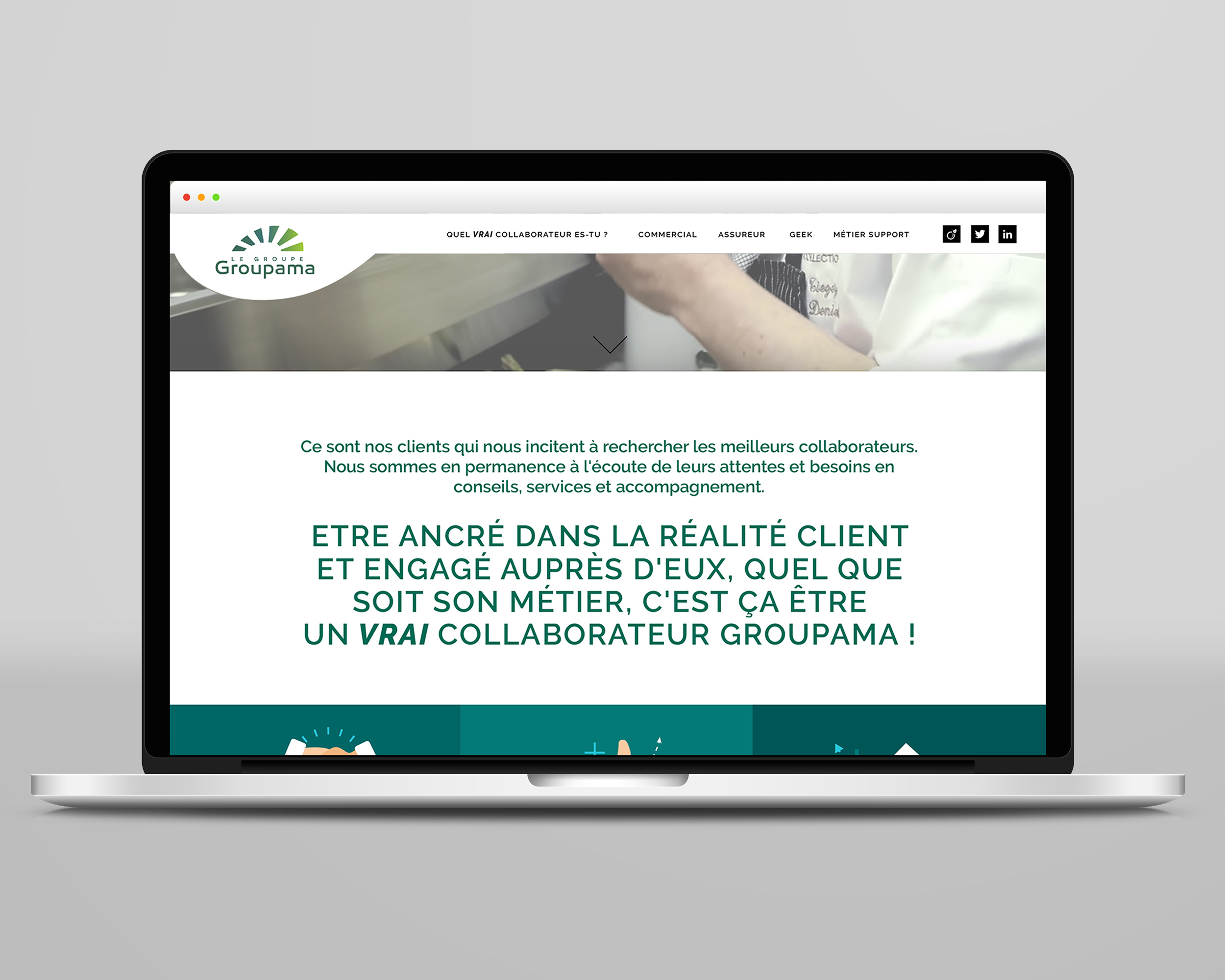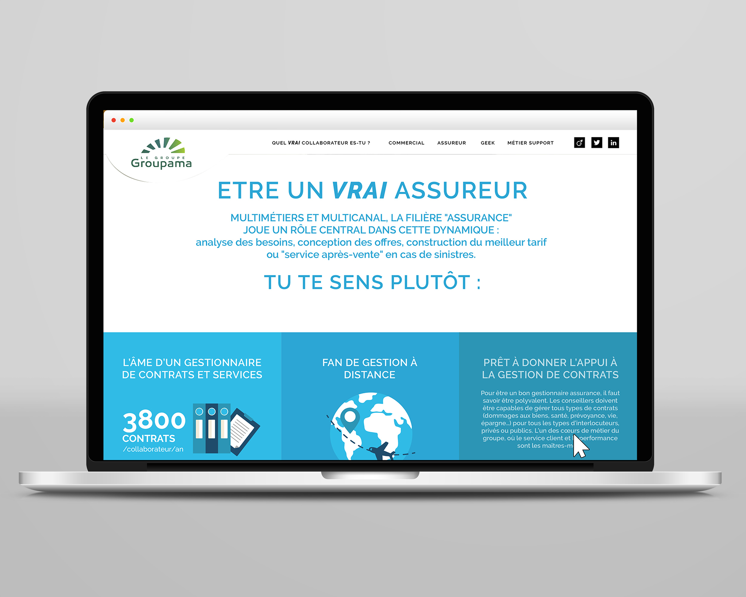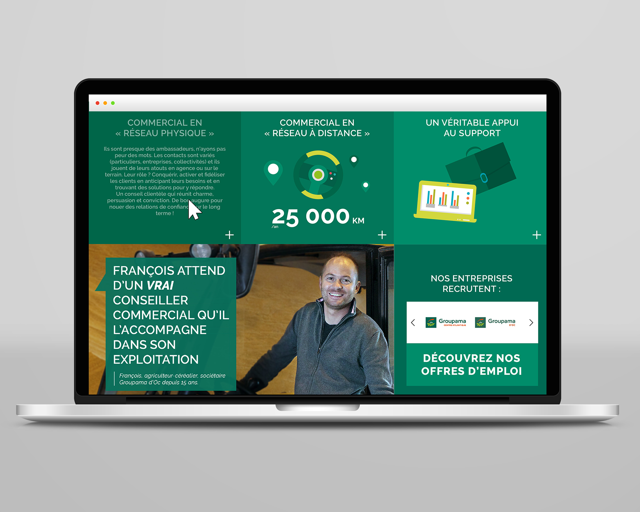 Réalisation du site web marque employeur de Groupama, arborescence, graphisme, mise en page, illustration.