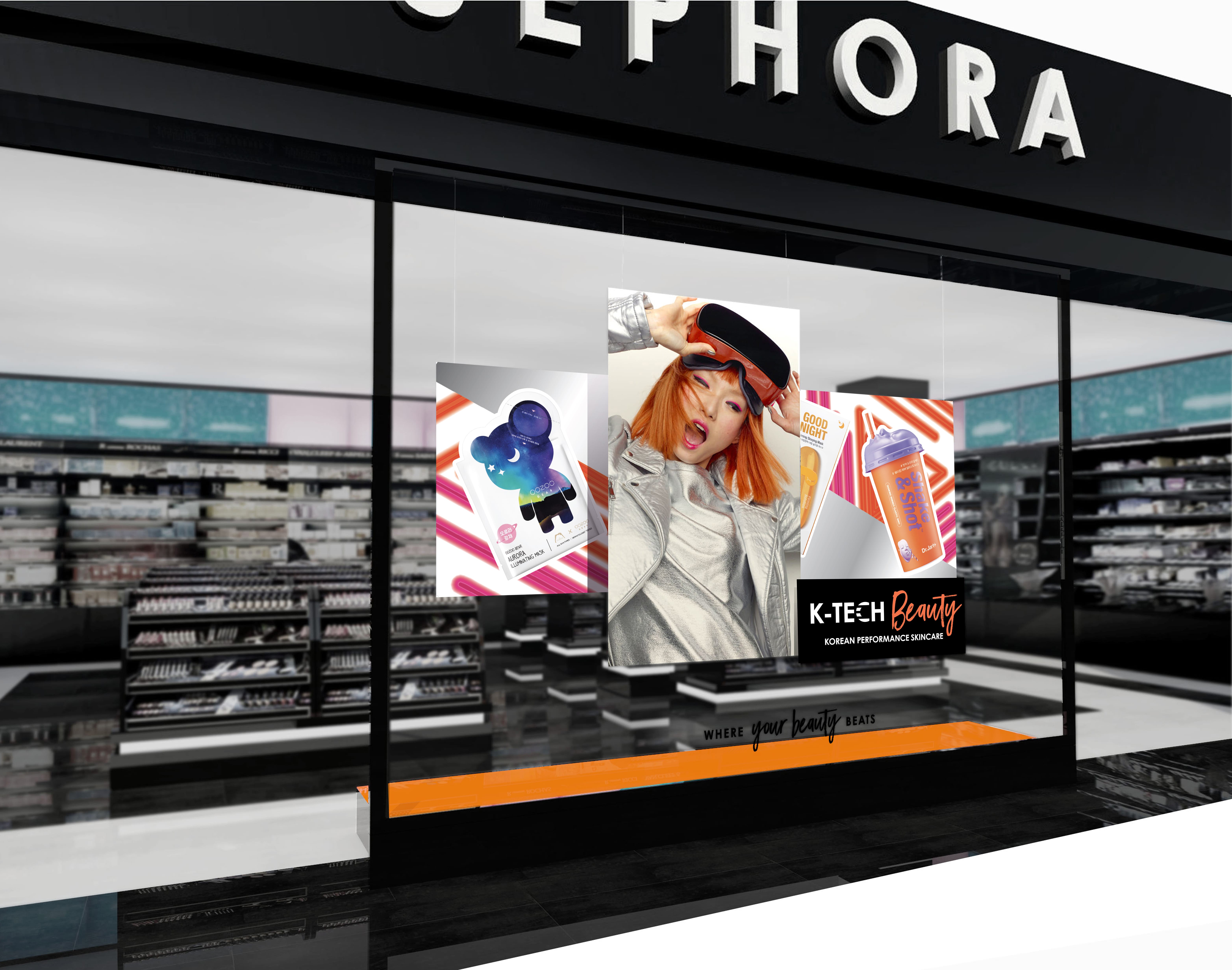 Création du nouveau concept vitrine réseau pour la marque Sephora. Vitrine collection K-tech Beauty, déclinaison instore et réseau international et site web.
